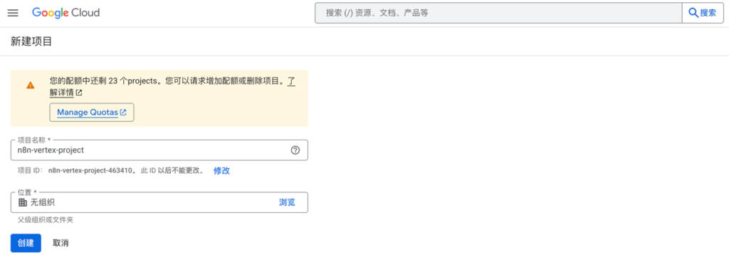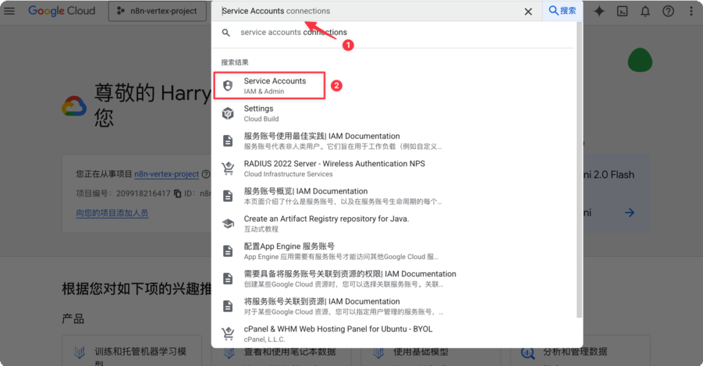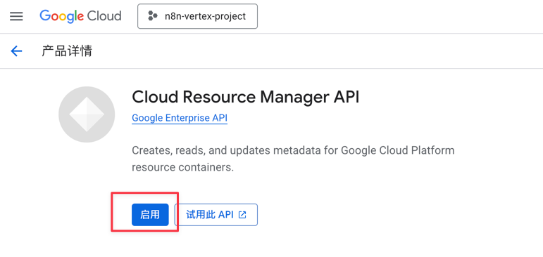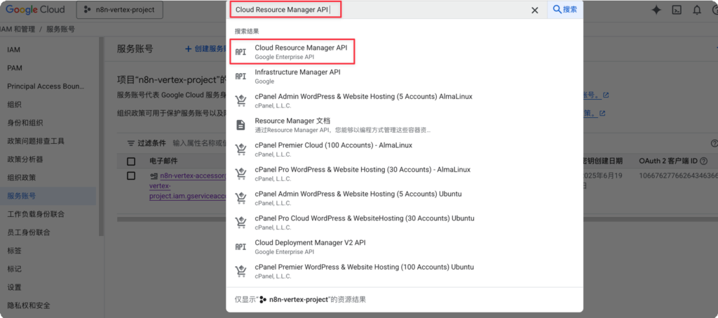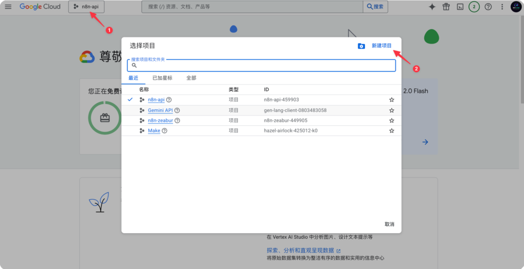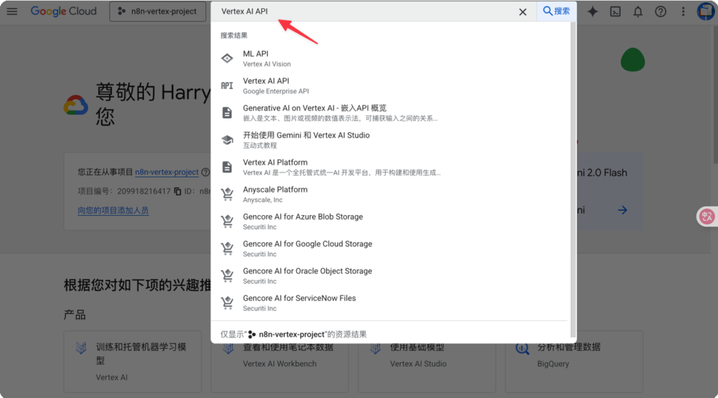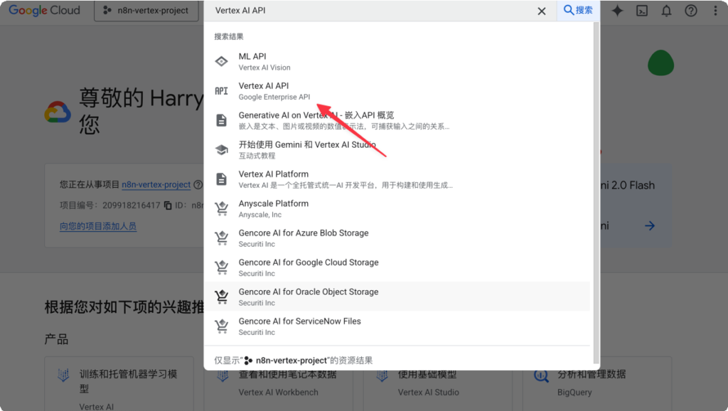 - Configure Google Cloud (GCP) environment. First, you need a Google Cloud account. After logging in, create a new project as your workspace, and then the most crucial step is to search for and enable the “Vertex AI API” service. This is equivalent to opening an official channel for subsequent communication between n8n and Google Cloud.