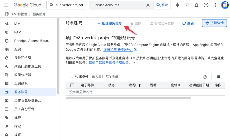 1In the list of service accounts, locate the n8n-vertex-accessor account you just created, and click on its email address link.